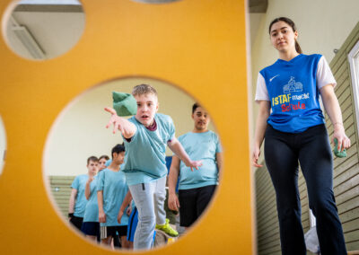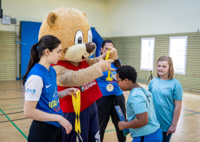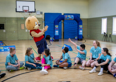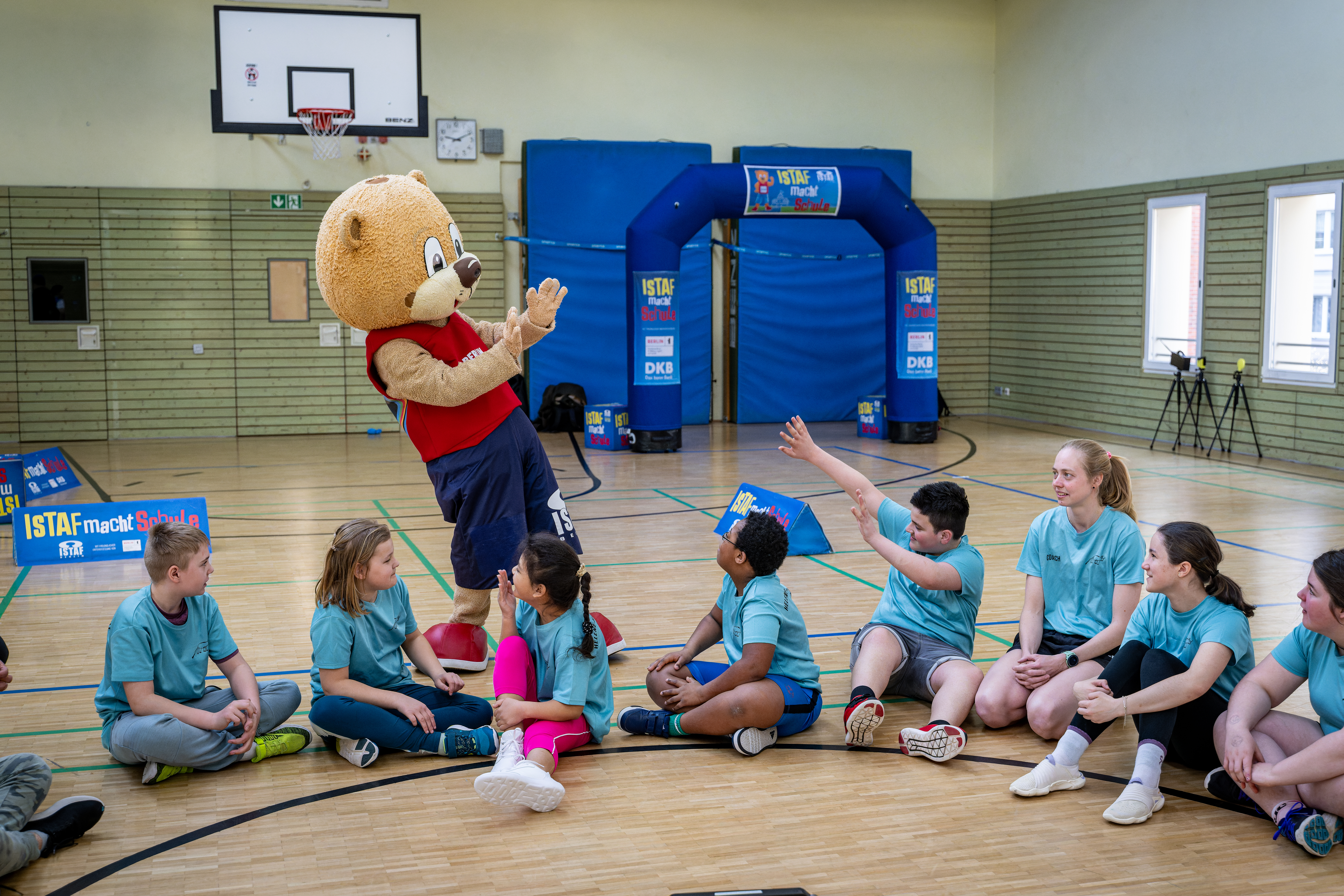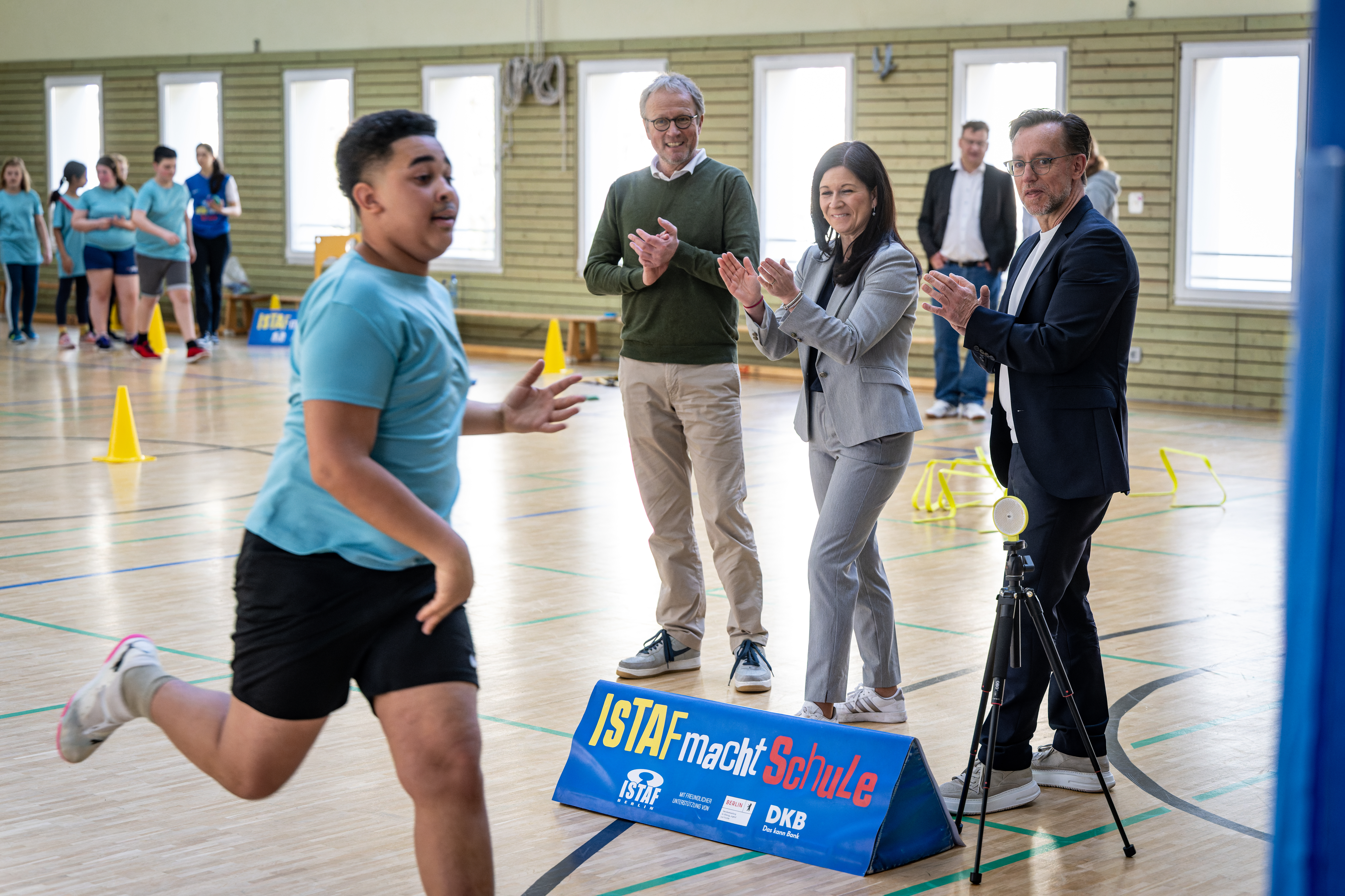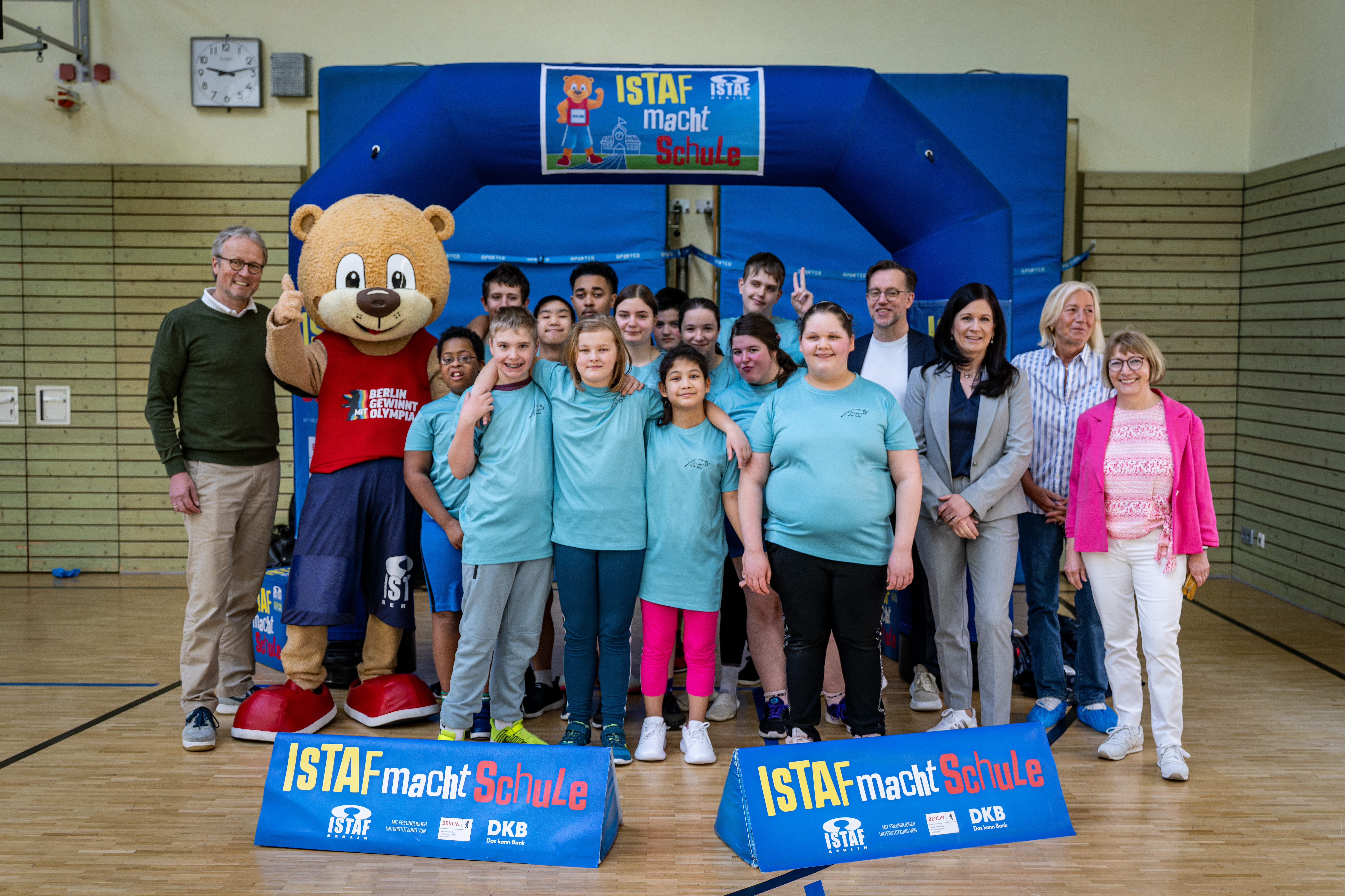 ISTAF MACHT SCHULE – und das im wahrsten Sinne! Denn immer mehr Berliner Schulen bewerben sich um einen Besuch des ISTAF MACHT SCHULE-Teams. Mehr als 100 Schulen wurden in den vergangenen Jahren besucht und weit über 7500 Schülerinnen und Schüler konnten am Sportbewegungsangebot teilnehmen. Am 19. März 2026 fuhr das ISTAF-Mobil an der Helene-Haeusler-Schule im Prenzlauer Berg vor und damit erstmals bei einer Förderschule mit dem Schwerpunkt geistige Entwicklung. Katrin Günther-Wünsch, Berlins Senatorin für Bildung, Jugend und Familie, Jan Walther, Vorstandsmitglied der Deutschen Kreditbank (DKB), und ISTAF-Maskottchen Berlino unterstützten das Trainerteam und feuerten die Schülerinnen und Schüler an.